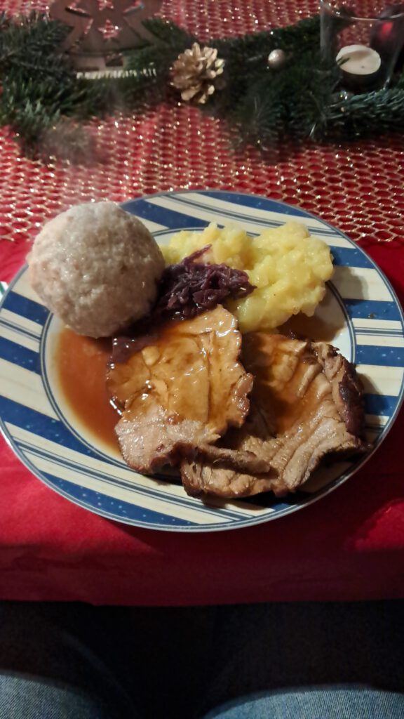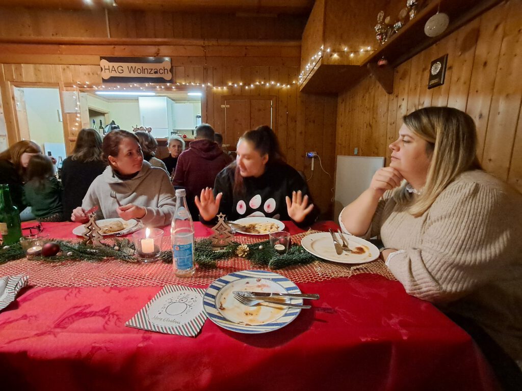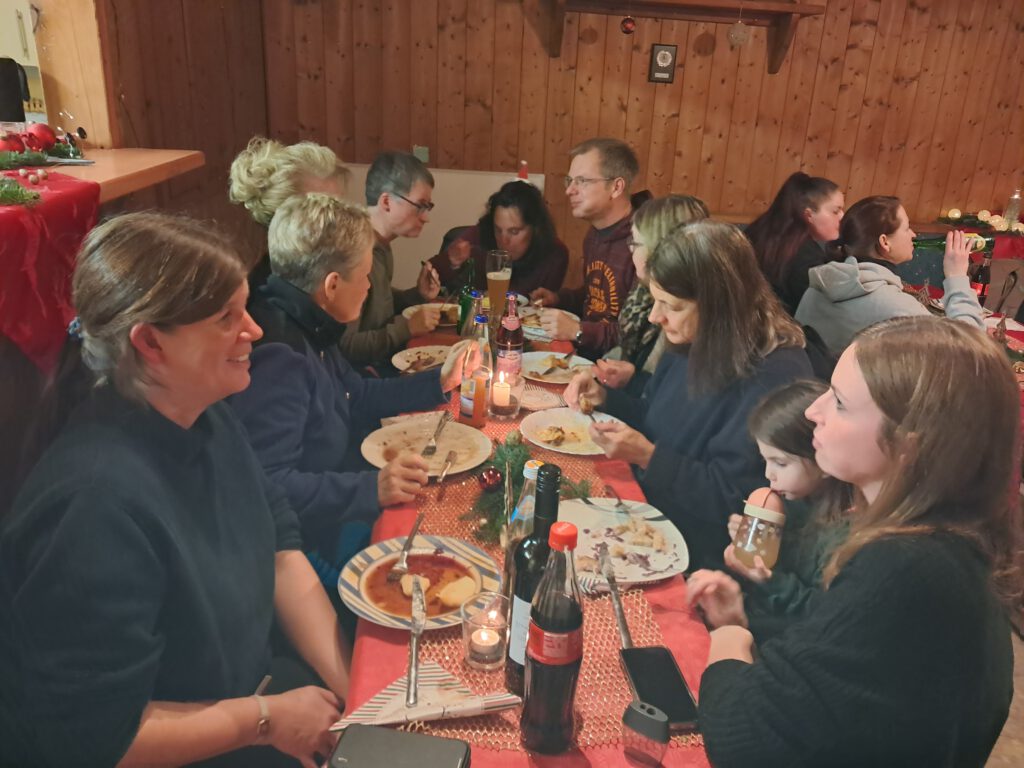 Um 19 Uhr begann dann die Weihnachtsfeier – und damit der gemütliche Teil des Abends. Für das leibliche Wohl war bestens gesorgt: In rauen Mengen gab es zwei verschiedene Braten, Knödel, Blaukraut, Kartoffelsalat und zusätzlich eine köstliche Gemüselasagne, sodass für jeden Geschmack etwas dabei war. Die reichhaltige Auswahl ließ keine Wünsche offen und lud zu genussvollen Pausen zwischen Gesprächen und Geselligkeit ein.